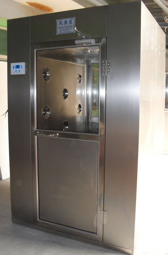 风淋室原理:风淋室内的空气由风机的作用经初效过滤器进入静压箱,经高效空气过滤器过滤后,洁净空气从风淋室的喷嘴高速喷出,喷嘴角度可调节,可有效地吹除人、身或携带物品表面附着的尘埃,吹下的尘埃再回收进入初效空气过滤器,如此循环可以达到风淋除尘净化的目的。可以有效的清除外部人员进入洁净区所带来的污染问题,并同时起到气闸室密闭洁净室的作用。风淋室通用性强,可与所有的洁净室与洁净厂房配套使用。